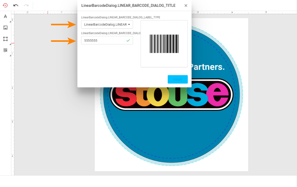 3. If you select barcode (for QR code, see step 5) you will get a pop up like to the image below. You will then need to select the type of barcode you would like to create and enter the corresponding code you wish to connect. After doing so, you can hit “INSERT” to add the barcode to your artwork.