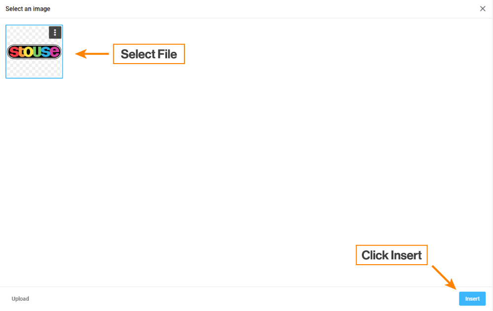 3. After selecting your file, it will appear in the window. Click the newly uploaded image to select it and hit “insert” in the bottom right corner.