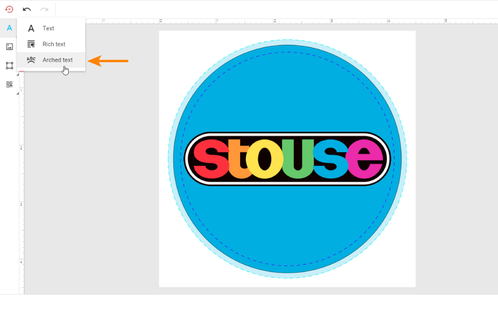 3. After selecting arched text, a text box will appear in the middle of your design. Delete the placeholder text and add your own verbiage. Then adjust the font, size, and placement to the way you want it. Once the text is placed where you like it, select the arched text bend tool in the top menu.