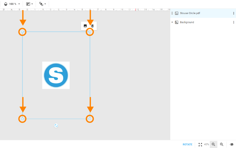 2. Once you have zoomed out, you can then use the handles in each corner to scale your art to fit within the template. As mentioned above, be sure your art fills the template, allows for enough bleed, and that all important design elements are within the caution zone. You can zoom in or out as needed to ensure that everything is correct.