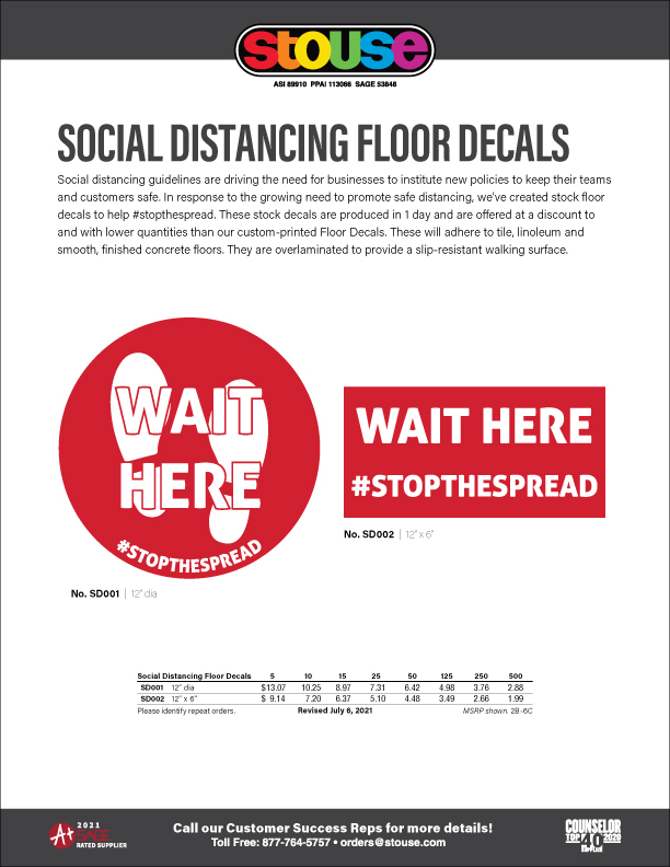 Social distancing guidelines are driving the need for businesses to institute new policies to keep their teams and customers safe. In response to the growing need to promote safe distancing, we’ve created stock floor decals to help #stopthespread. These stock decals are produced in 1 day and are offered at a discount to and with lower quantities than our custom-printed Floor Decals. These will adhere to tile, linoleum and smooth, finished concrete floors. They are overlaminated to provide a slip-resistant walking surface.