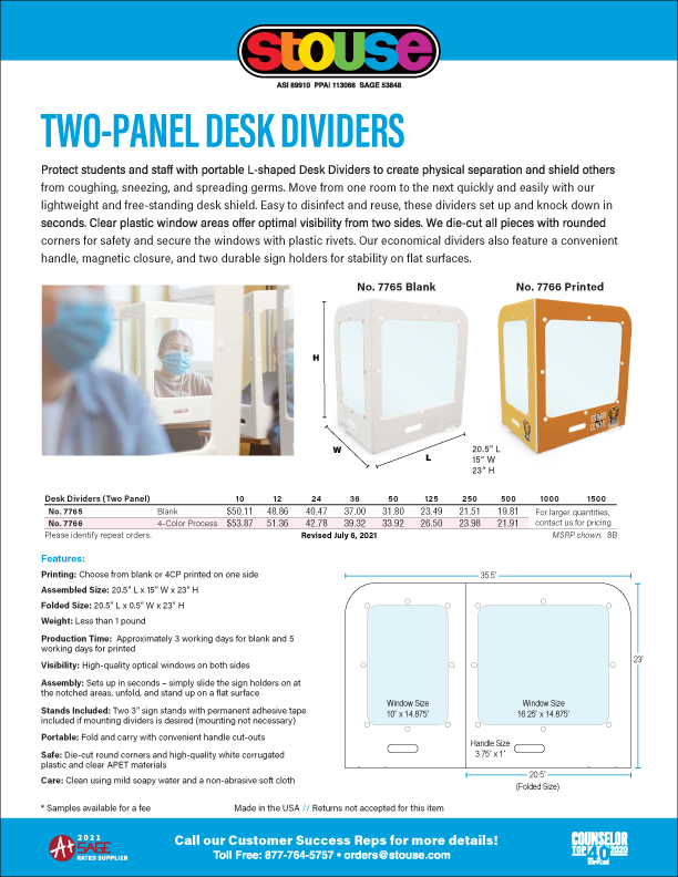 Protect students and staff with portable Desk Dividers to create physical separation and shield others from coughing, sneezing, and spreading germs. Move from one room to the next quickly and easily with our lightweight and free-standing desk shield. Easy to disinfect and reuse, these dividers set up and knock down in seconds. Clear plastic window areas offer optimal visibility from two or three sides. We die-cut all pieces with rounded corners for safety and secure the windows with plastic rivets. Our economical dividers also feature a convenient handle. Our two-panel version includes a magnetic closure and two durable sign holders for stability on flat surfaces.