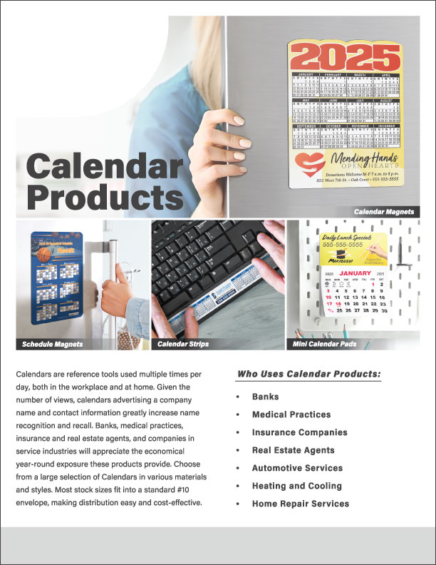 Banks, medical practices, insurance and real estate agents, and companies in service industries will appreciate the economical year-round exposure these products provide. Visit Calendars to choose the best product for your application.